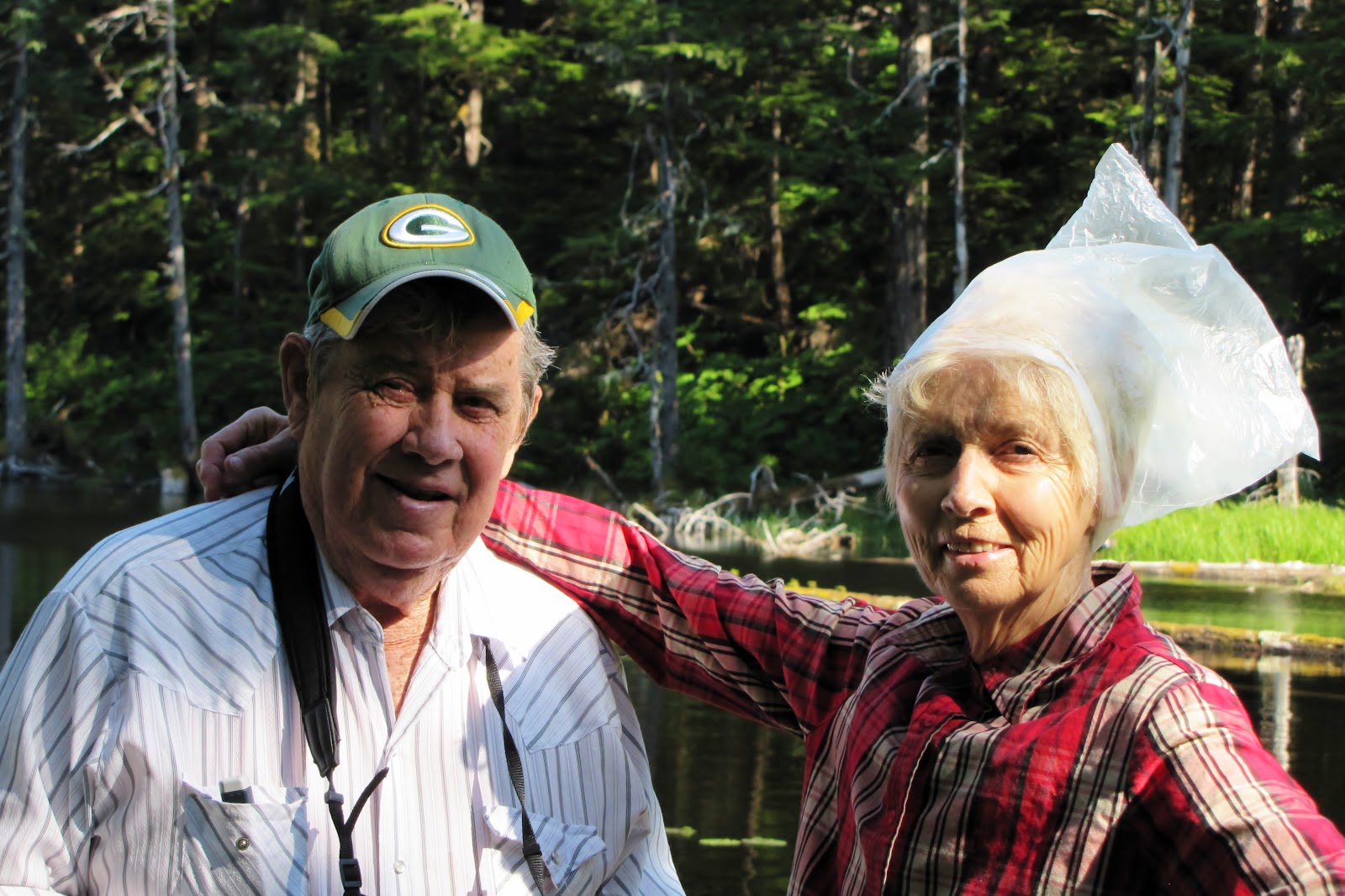 My mom invented a new skeeter-hat for those days when the no-see-ums will not stay out of your hair. Personally I like the stuff that causes birth defects...DEET. We hiked (52 stairs plus trail) into High Bush Lake on the last sunny day.